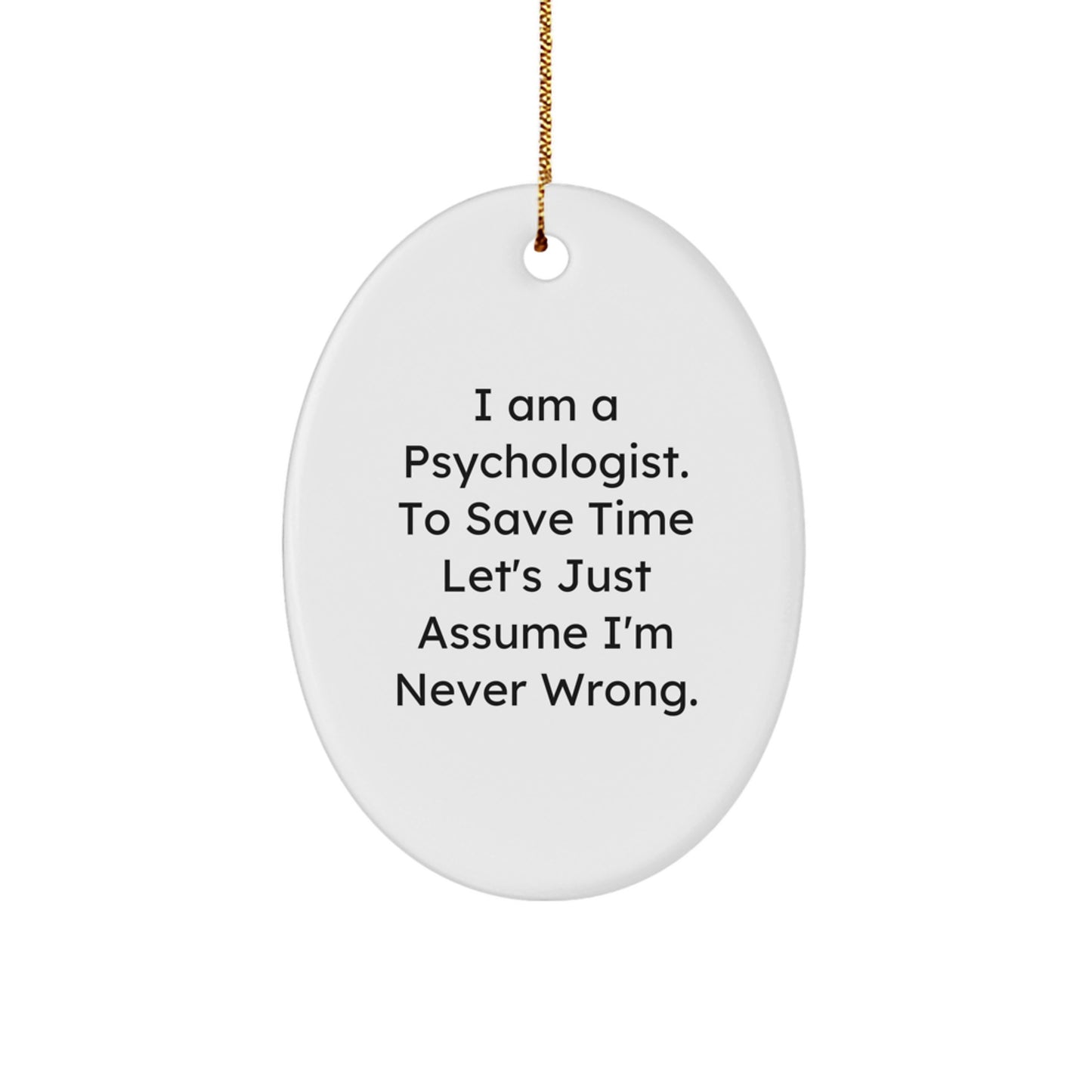- Get a funny Psychologist gift for men or women with this Oval Ornament featuring the hilarious quote 'I Am A Psychologist. To Save Time Let's Just Assume I'm Never Wrong.' This beautiful white oval ornament is crafted from sturdy MDF with a high-gloss plastic finish, making it a great choice for households with children or pets. It's lightweight, resistant to breaking, and comes with a festive gold cord for easy hanging.