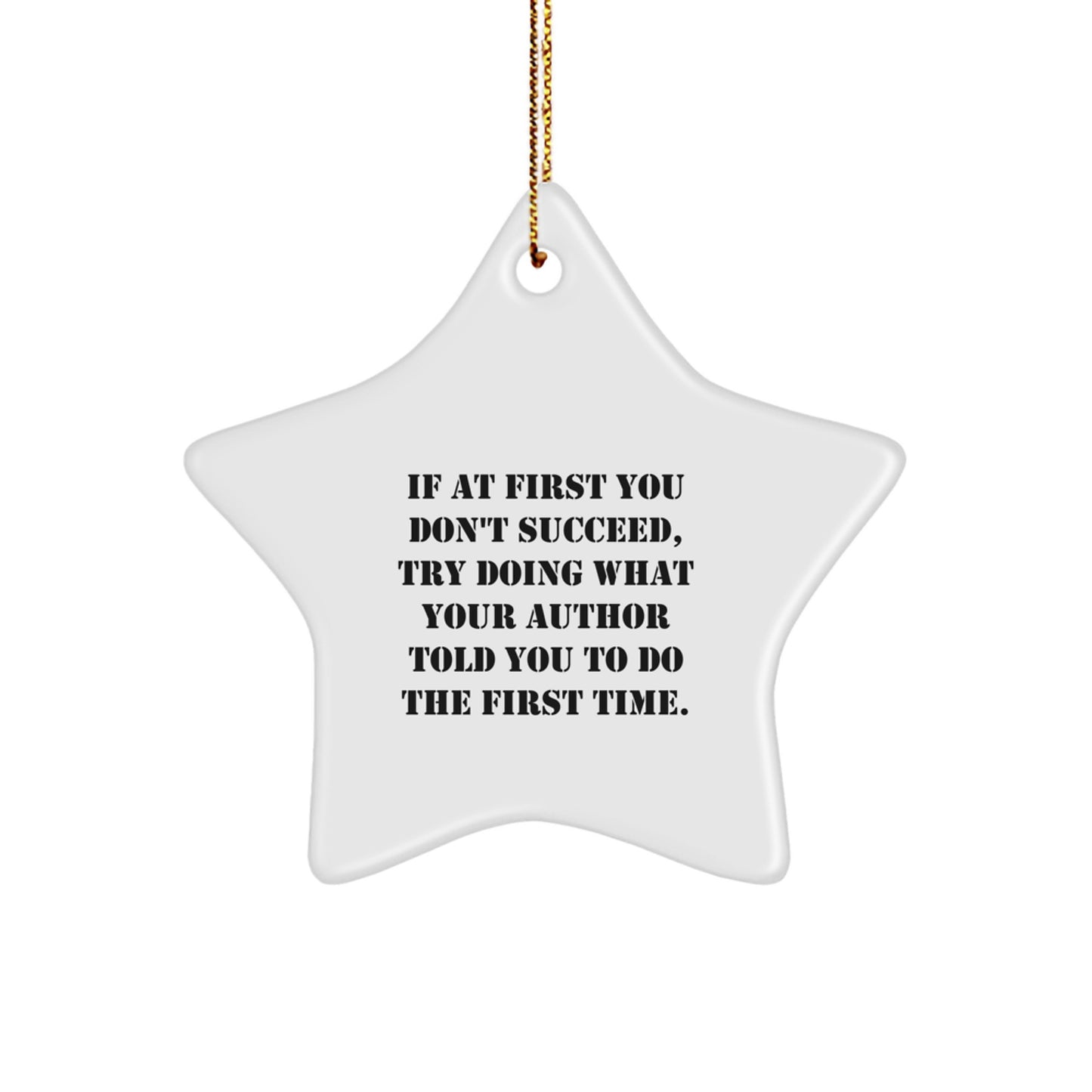 This delightful Star Ornament features a quote that's sure to resonate with writers and readers alike: 'If At First You Don't Succeed, Try Doing What Your Author Told You To Do The First Time.' The author's words of wisdom are printed in vibrant colors on a white, star-shaped Star Ornament, making it a thoughtful and unique gift for any occasion, especially Christmas.