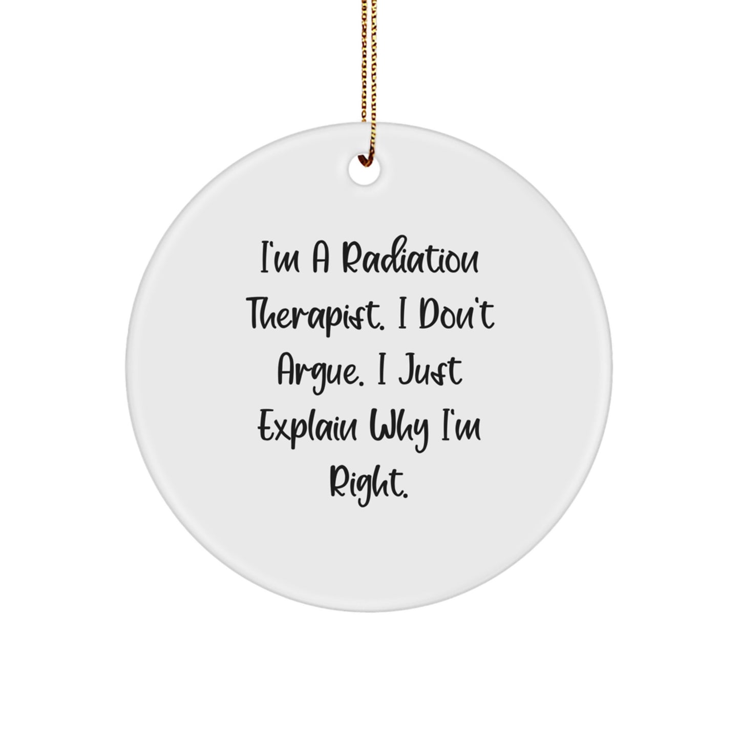 - Gift this unique 'I'm A Radiation Therapist. I Don't Argue. I Just Explain Why I'm Right.' Circle Ornament to your loved ones and let them know how much you appreciate their support, making it a thoughtful and personalized Christmas gift for Radiation Therapist friends and family.