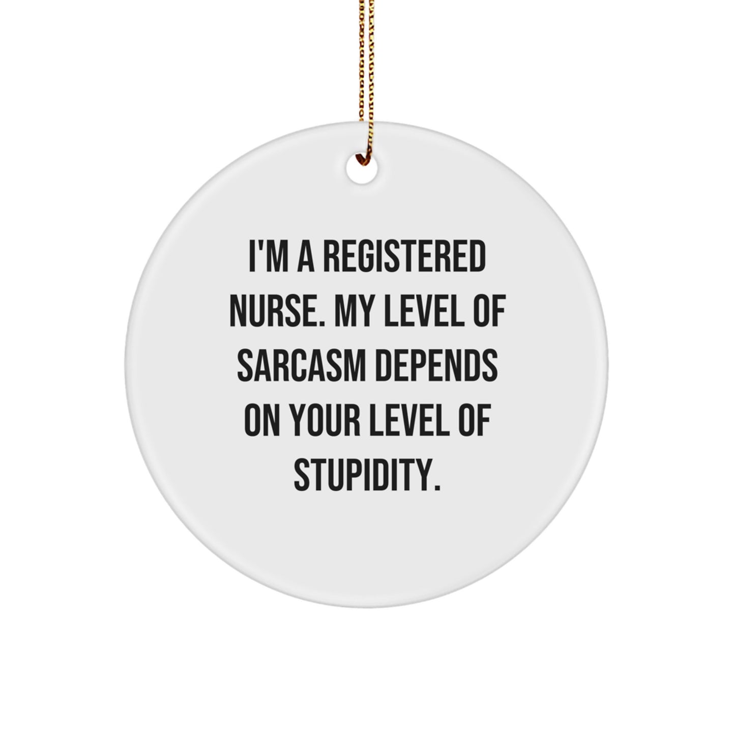 - Say thank you to a Registered Nurse with this funny Circle Ornament featuring a sassy quote - 'I'm A Registered Nurse. My Level Of Sarcasm Depends On Your Level Of Stupidity.' It's the perfect way to add a little humor to their holiday season and show your appreciation for their hard work and dedication.
