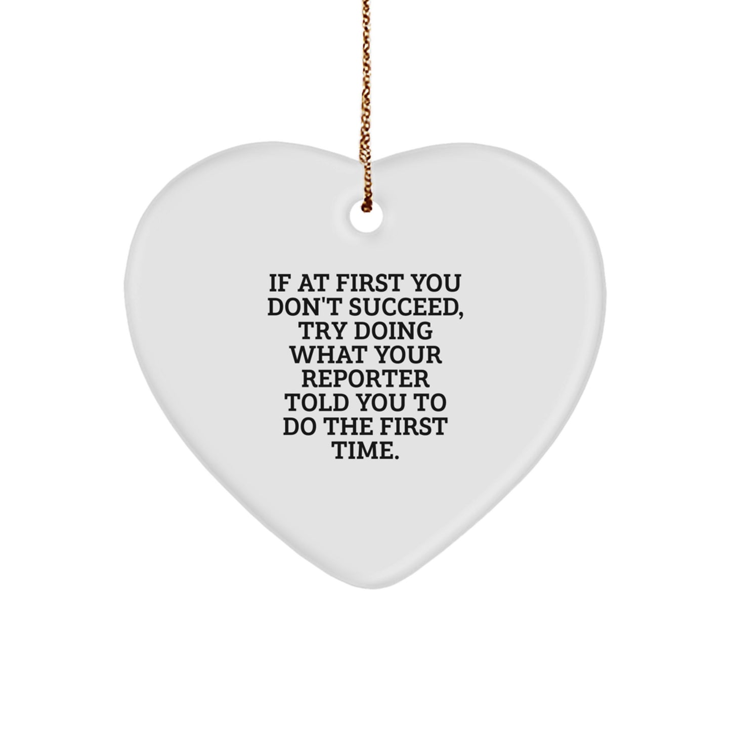 - Our Heart Ornament features a funny quote, 'If At First You Don't Succeed, Try Doing What Your Reporter Told You To Do The First Time,' that is sure to bring a smile to the Reporter's face. It's a great way to show your appreciation for their hard work and dedication.