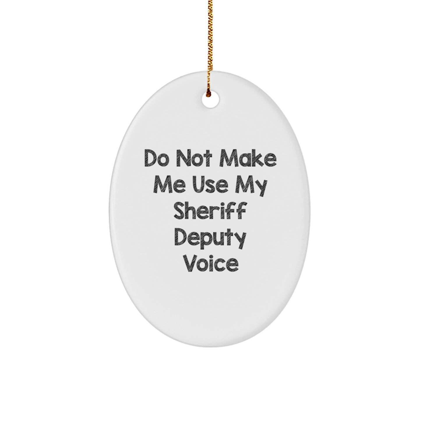 - This Sheriff Deputy oval ornament is a unique and thoughtful gift for any Sheriff Deputy in your life. Made from sturdy MDF with a high-gloss plastic finish, this ornament is vibrantly printed from edge-to-edge via sublimation, ensuring bright and vivid colors. The quote 'Do Not Make Me Use My Sheriff Deputy Voice' is a humorous way to remind him of his duties.