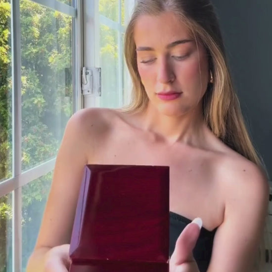 Your piece is lovingly packaged in a complimentary soft touch box for easy gifting. Elevate your presentation by upgrading to the mahogany style luxury box, which features a brilliant LED spotlight.