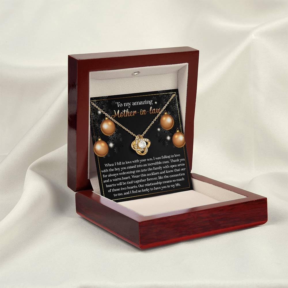 When I fell in love with your son, I was falling in love with the boy you raised into an incredible man. Thank you for always welcoming me into the family with open arms and a warm heart. Wear this necklace and know that our hearts will be tied together forever, like the connection of these two hearts. Our relationship means so much to me, and I feel so lucky to have you in my life.”