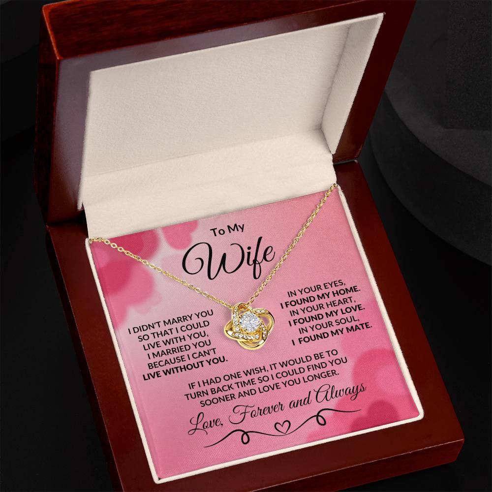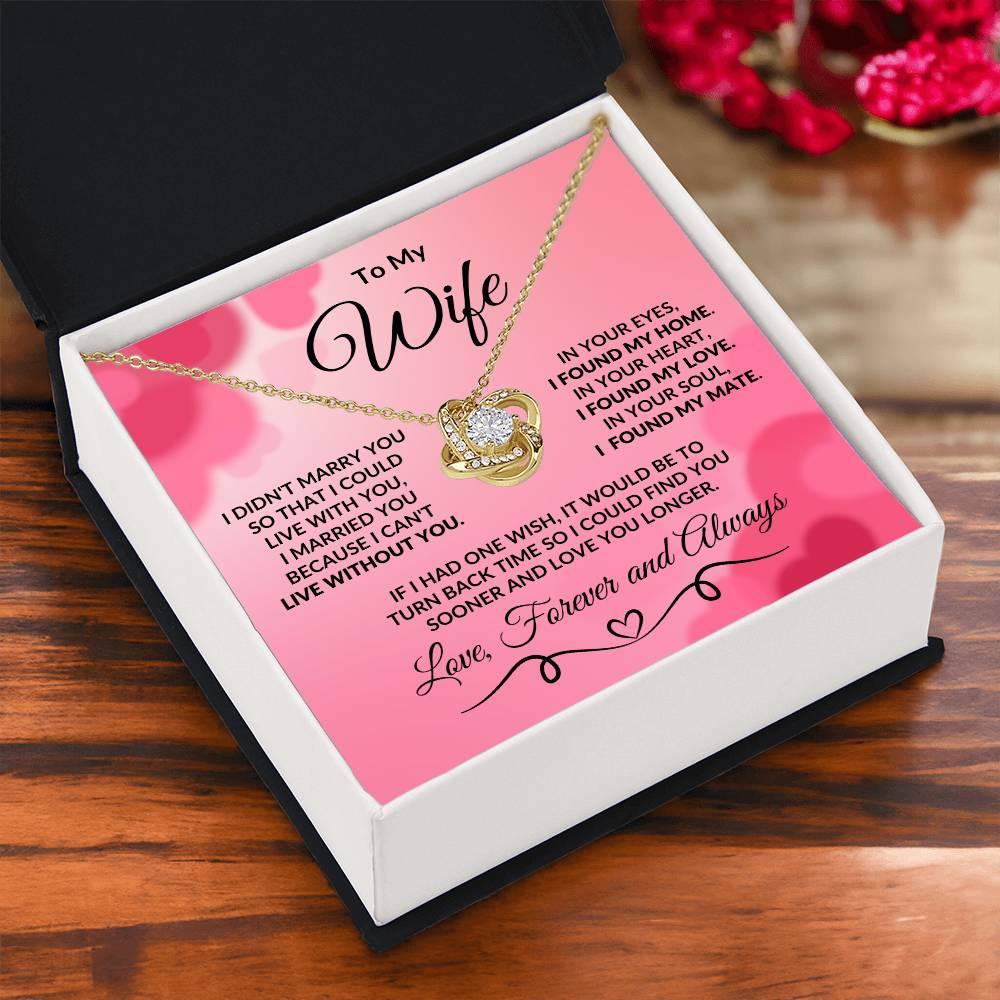 A beautiful gift for your Sweetheart. "To my wife, I didn't marry you so that I could live with you. I married you because I can't live without you. In your eyes, I found my home. In your heart, I found my love. In your soul, I found my mate. If I had one wish, it would be to turn back time so I could find you sooner and love you longer. Love, Forever and always."