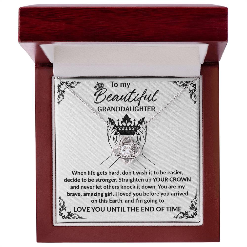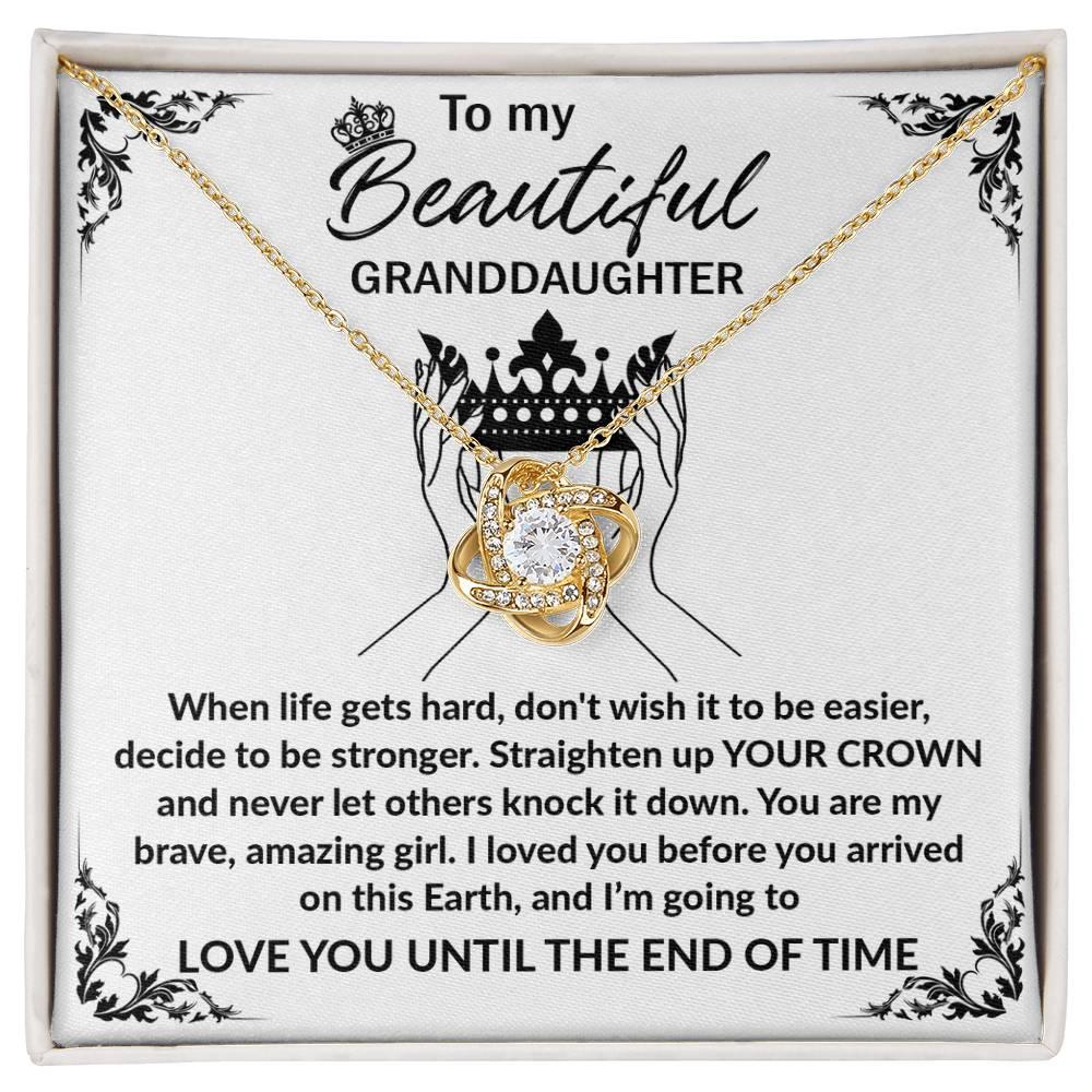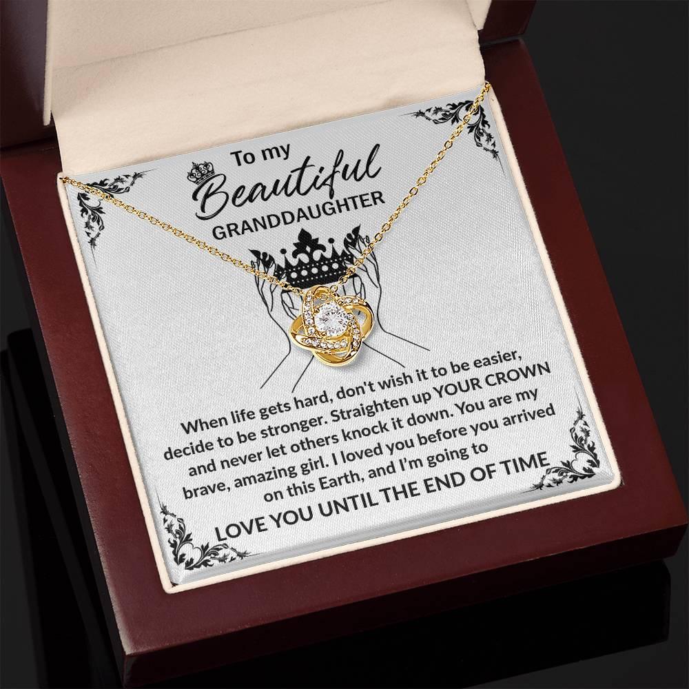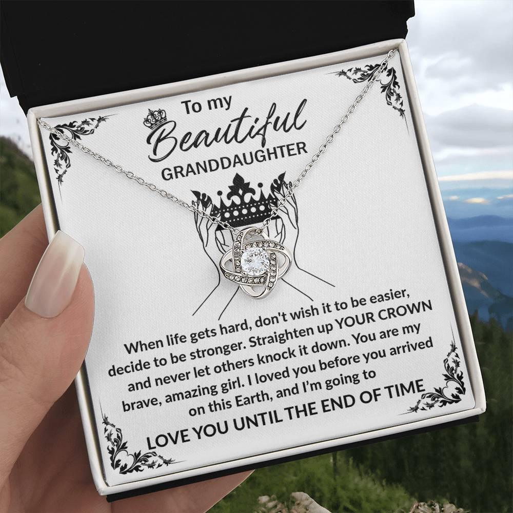 Gift your granddaughter with this timeless treasure with this inspirational message, "To my beautiful granddaughter, When life gets hard, don't wish it to be easier, decide to be stronger. Straighten up your crown and never let others knock it down. You are my brave, amazing girl. I loved you before you arrived on this Earth, and I'm going to love you until the end of time."