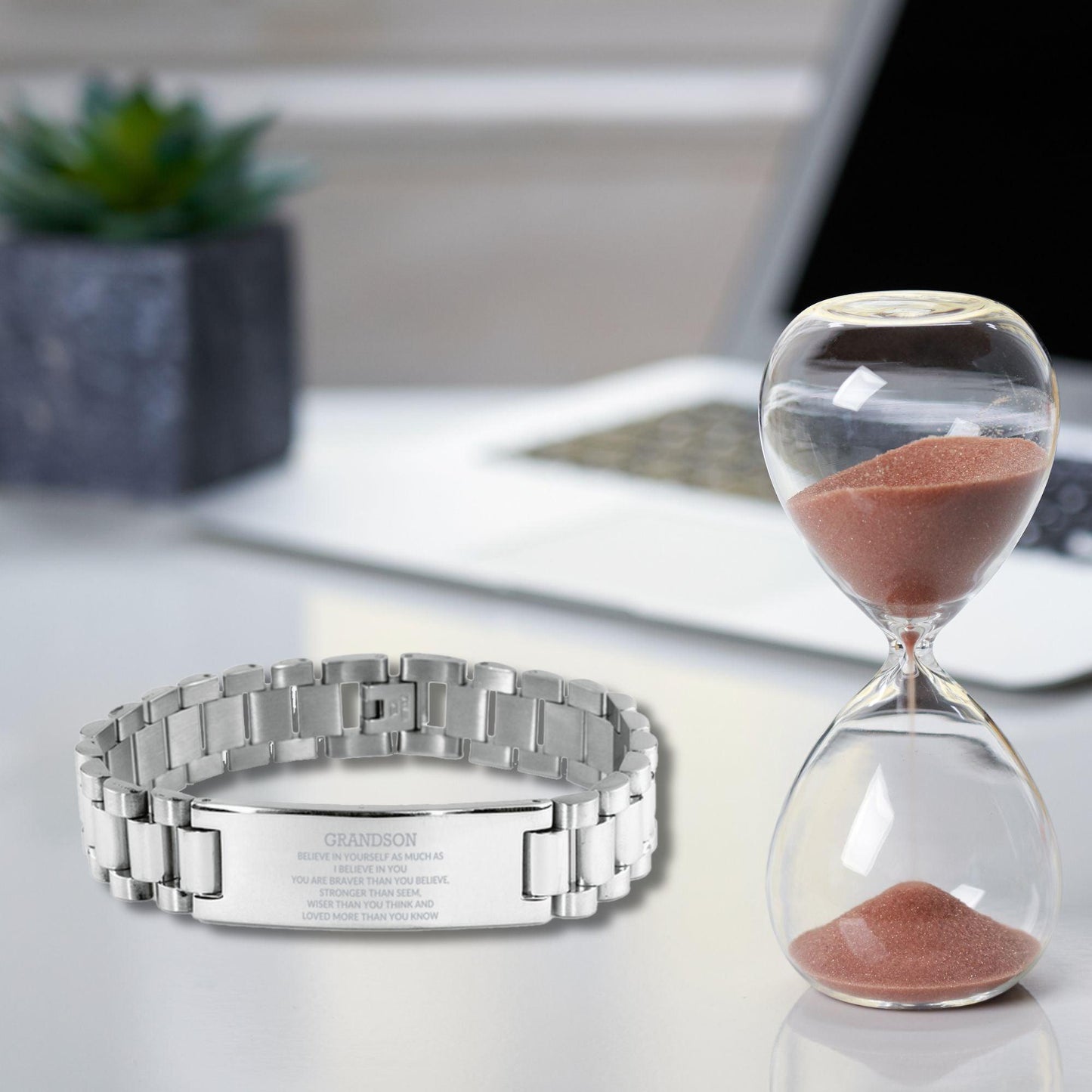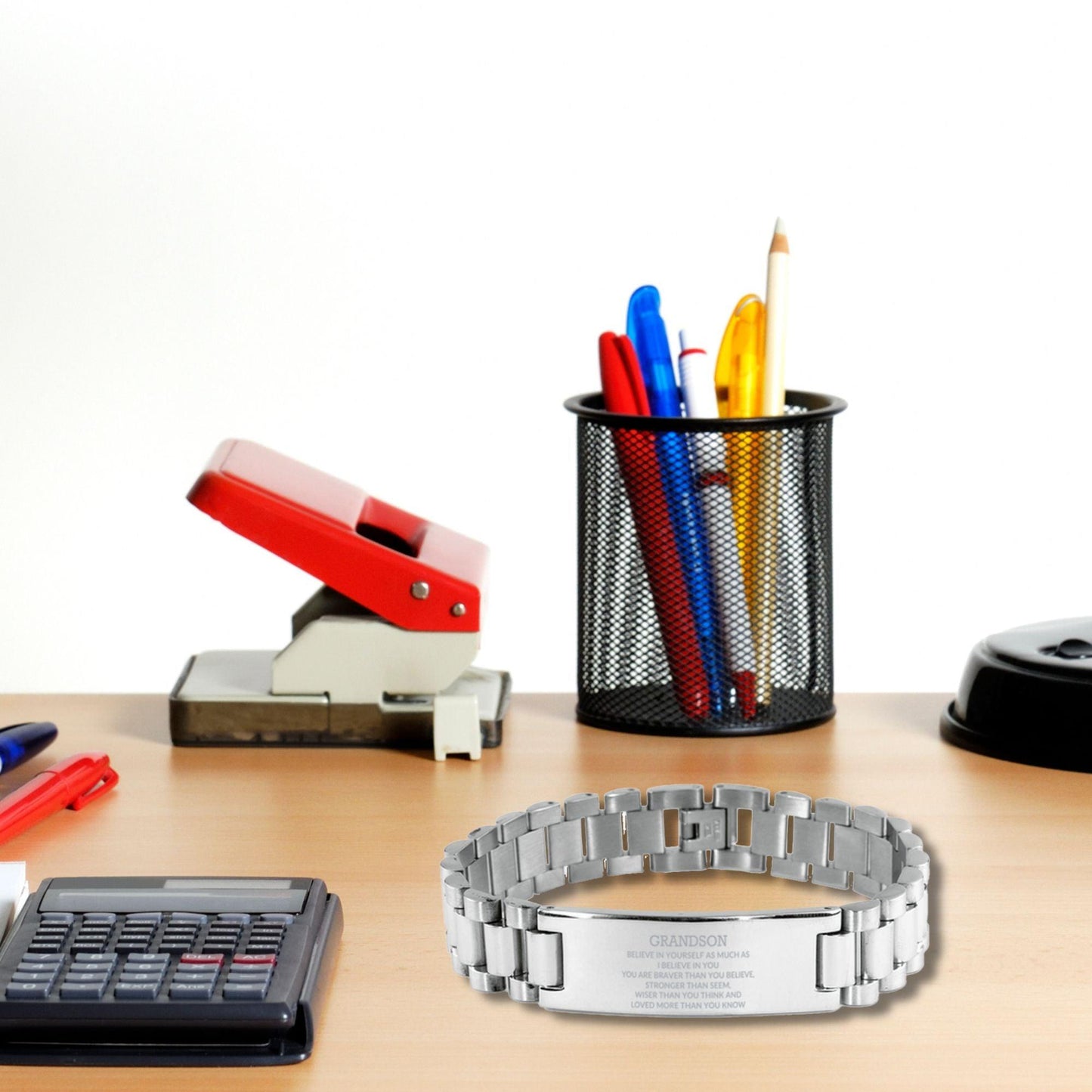 Grandson Engraved Ladder Stainless Steel Bracelet, Motivational Heartfelt Birthday, Christmas Holiday Gifts For Grandson, You are Braver than you Believe, Loved More than you Know