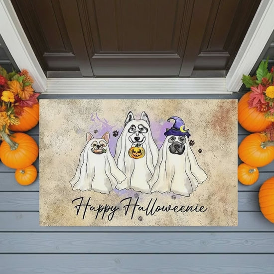 Welcome all your spooky visitors—two-legged and four-legged—with our Happy Halloweenie Dog Doormat! 🐶👻 Featuring three adorable dogs dressed as friendly ghosts, complete with pumpkins, paw prints, and a witch hat, this doormat blends humor and charm for the perfect Halloween entryway accent.