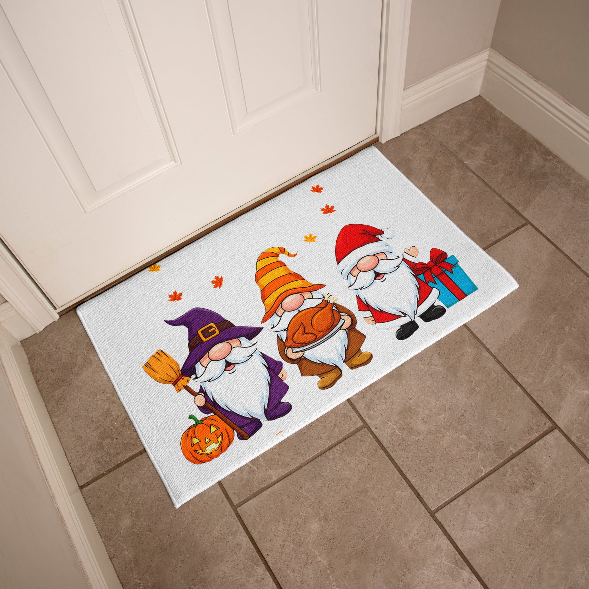 Holiday Gnome Trio Doormat – Halloween, Thanksgiving & Christmas All-in-One Welcome Mat – Cute Seasonal Full-Color Entry Rug