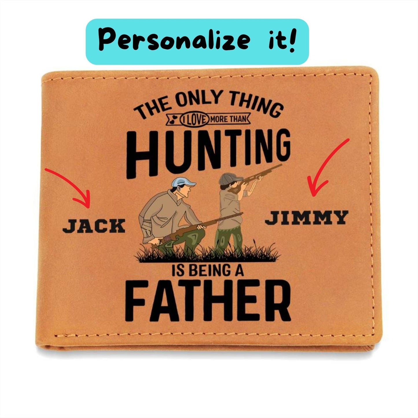 Featuring a unique quote that reads, "The only thing I love more Hunting is being a Father," this wallet is a heartfelt reminder of the joy and fulfillment of both passions. Personalize the wallet with the names of the dad and son to make it a true keepsake gift. Whether you're out in the wilderness or spending quality time with your family, this wallet constantly reminds you of the things that truly matter in life.