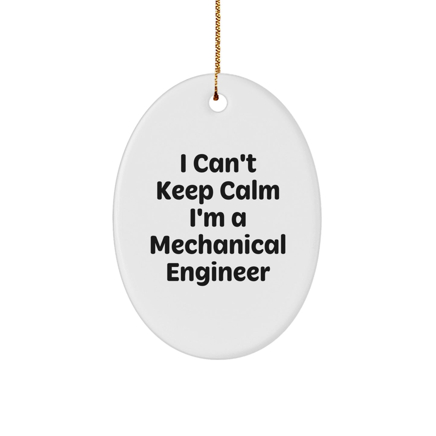 - This funny oval ornament is the perfect way to show off your Mechanical Engineer's profession and add some humor to your holiday decorations. Its sturdy MDF construction and vibrant colors ensure that it will last for years to come. This unique gift is perfect for friends, family members, or coworkers who love to have a good sense of humor. So why wait? Get your I Can't Keep Calm I'm A Mechanical Engineer oval ornament today and make it a holiday to remember!