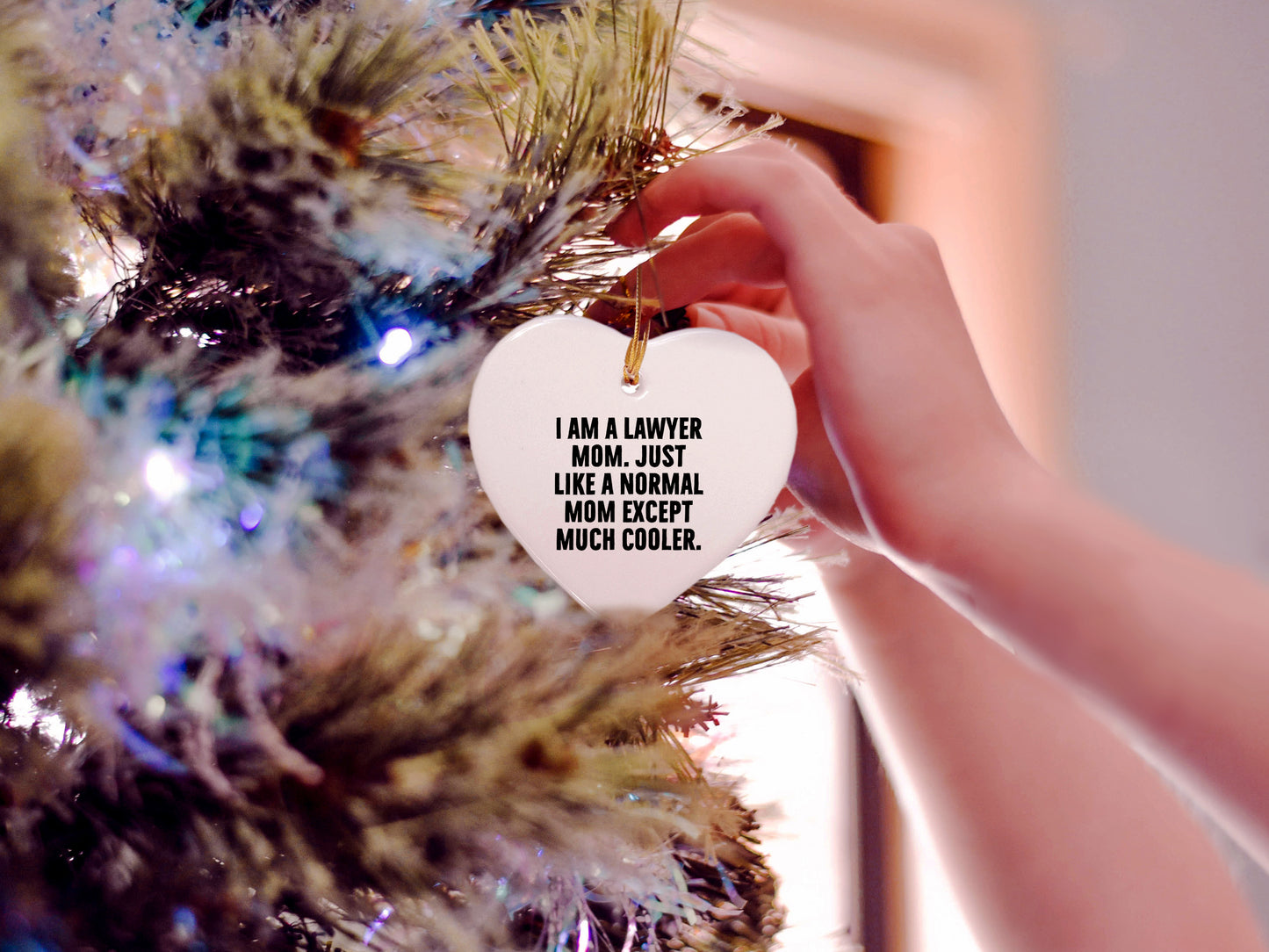 This heart-shaped ornament is crafted from MDF with a high-gloss plastic finish, ensuring long-lasting designs. The quote 'I Am A Lawyer Mom. Just Like A Normal Mom Except Much Cooler.' is printed from edge-to-edge via Sublimation, making it a bright and eye-catching addition to any Christmas tree or office decor. Plus, it's lightweight and resistant to breaking, making it a great choice for households with children or pets.