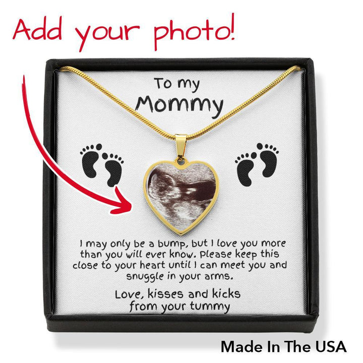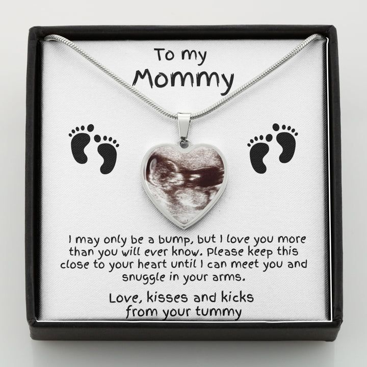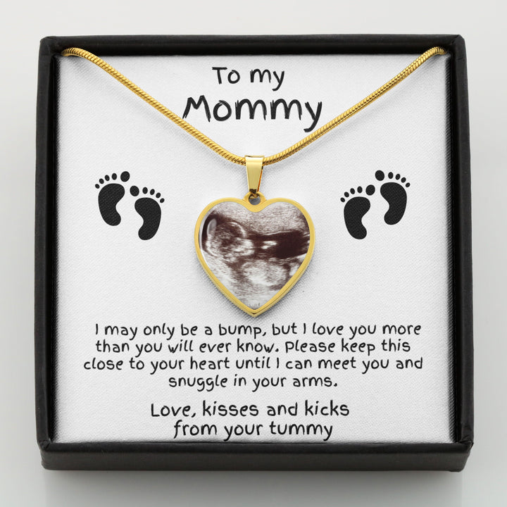The message card reads: To my Mommy, I may only be a bump, but I love you more than you ever know. Please keep this close to your heart until I can meet you and rest in your arms. Love, kisses and kicks from your tummy