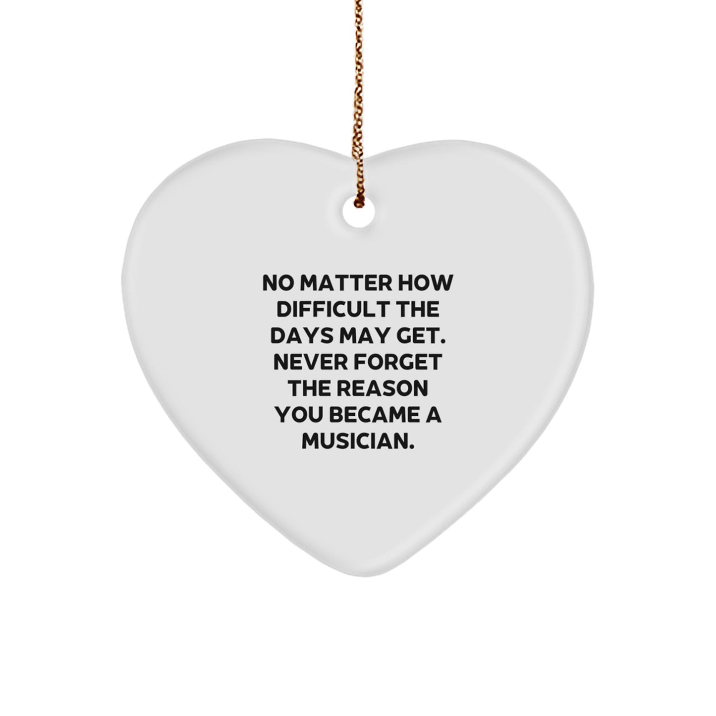 - The quote 'No Matter How Difficult The Days May Get. Never Forget The Reason You Became A Musician.' is a great reminder of the reasons we became musicians in the first place. This Heart Ornament is a beautiful way to show your appreciation for the musician in your life and remind them of their passion and dedication to music.