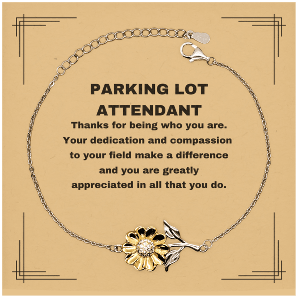- PERFECT Parking Lot Attendant GIFT - Sunflower represents happiness, optimism, honesty, longevity, peace, admiration, and devotion. This beautiful Sunflower Bracelet is a premium quality gift for Parking Lot Attendant that's a perfect way to express your love.