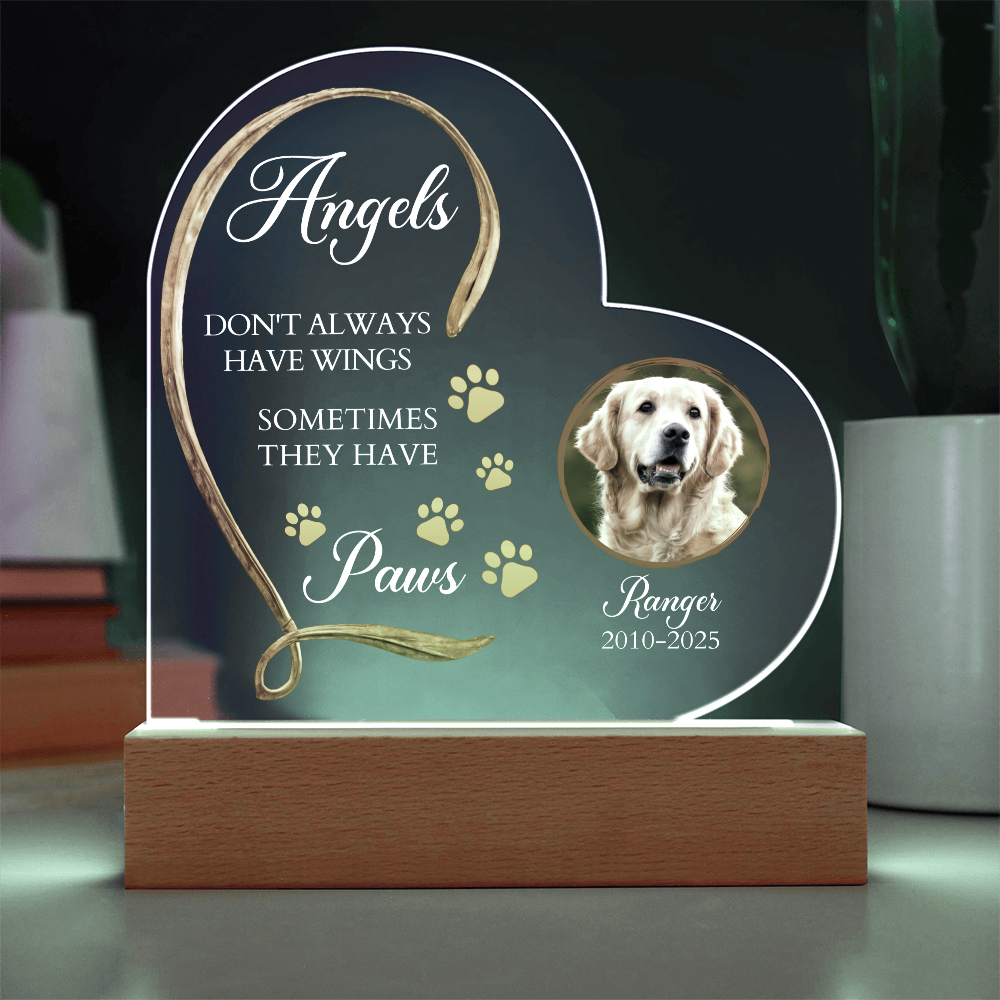 Personalized Pet Memorial Heart-Shaped Acrylic Plaque – “Angels Don't Always Have Wings” – Custom Photo, Name & Dates – Dog or Cat Loss Remembrance Gift with LED Light Base