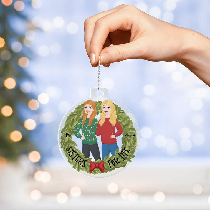 Personalized Sisters for Life Acrylic Ornament – Custom Names, Holiday Wreath Design, Best Friend Gift, Christmas Keepsake for Two Sisters