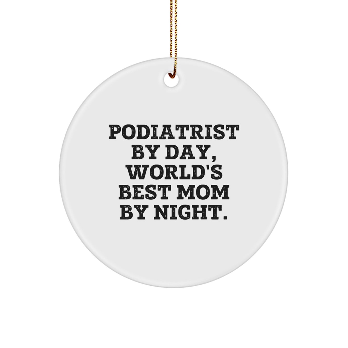 - Get a unique and thoughtful gift for your loved ones with this 'Podiatrist By Day, World's Best Mom By Night.' circle ornament, made from durable MDF and featuring a vibrant white color with a high-gloss finish, measuring 2.75 inches tall, 1/8 inch thick, and weighing 0.5 ounces, with a festive gold cord for easy hanging. Perfect for Christmas decoration, this ornament is lightweight and resistant to breaking, making it a great choice for households with children or pets.