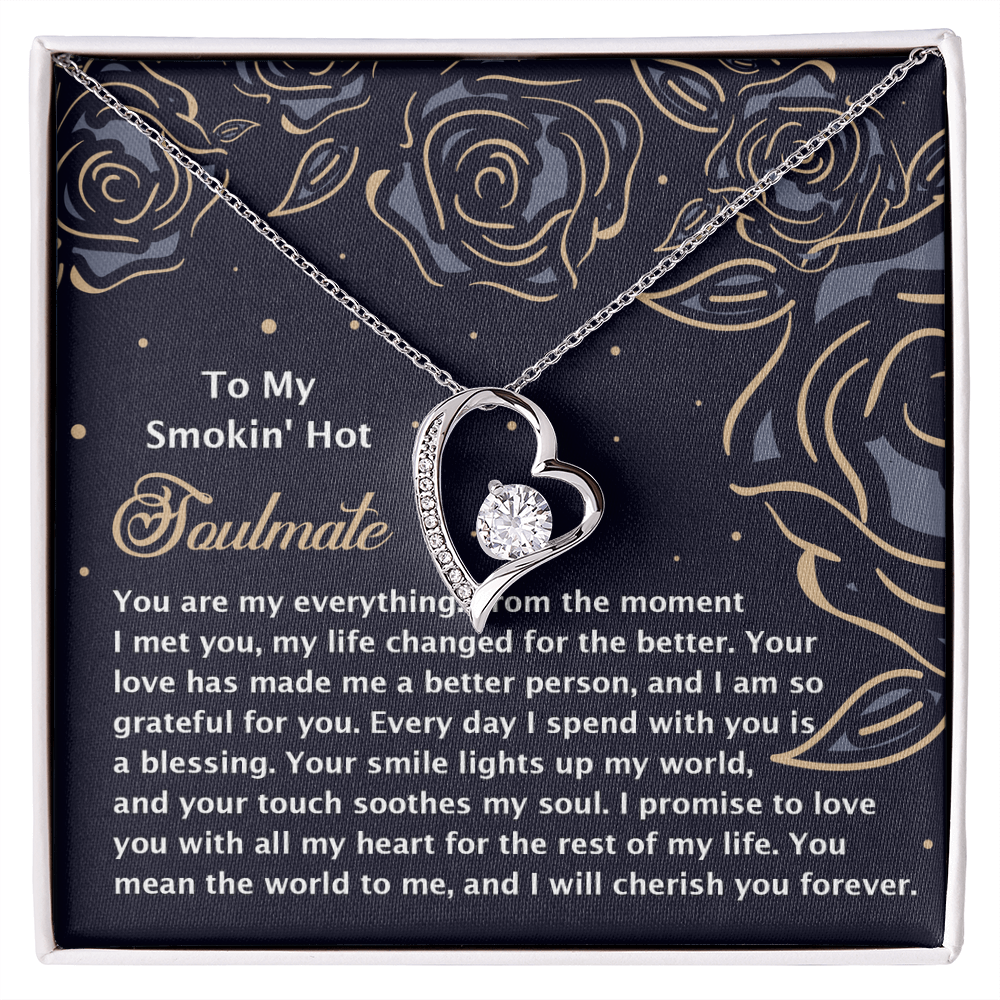 "To My Smokin' Hot Soulmate – You are my everything. From the moment I met you, my life changed for the better. Your love has made me a better person, and I am so grateful for you. Every day I spend with you is a blessing. Your smile lights up my world, and your touch soothes my soul. I promise to love you with all my heart for the rest of my life. You mean the world to me, and I will cherish you forever."