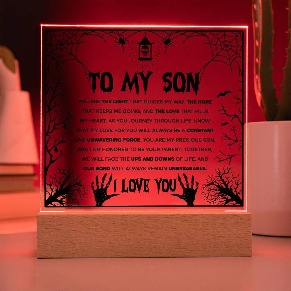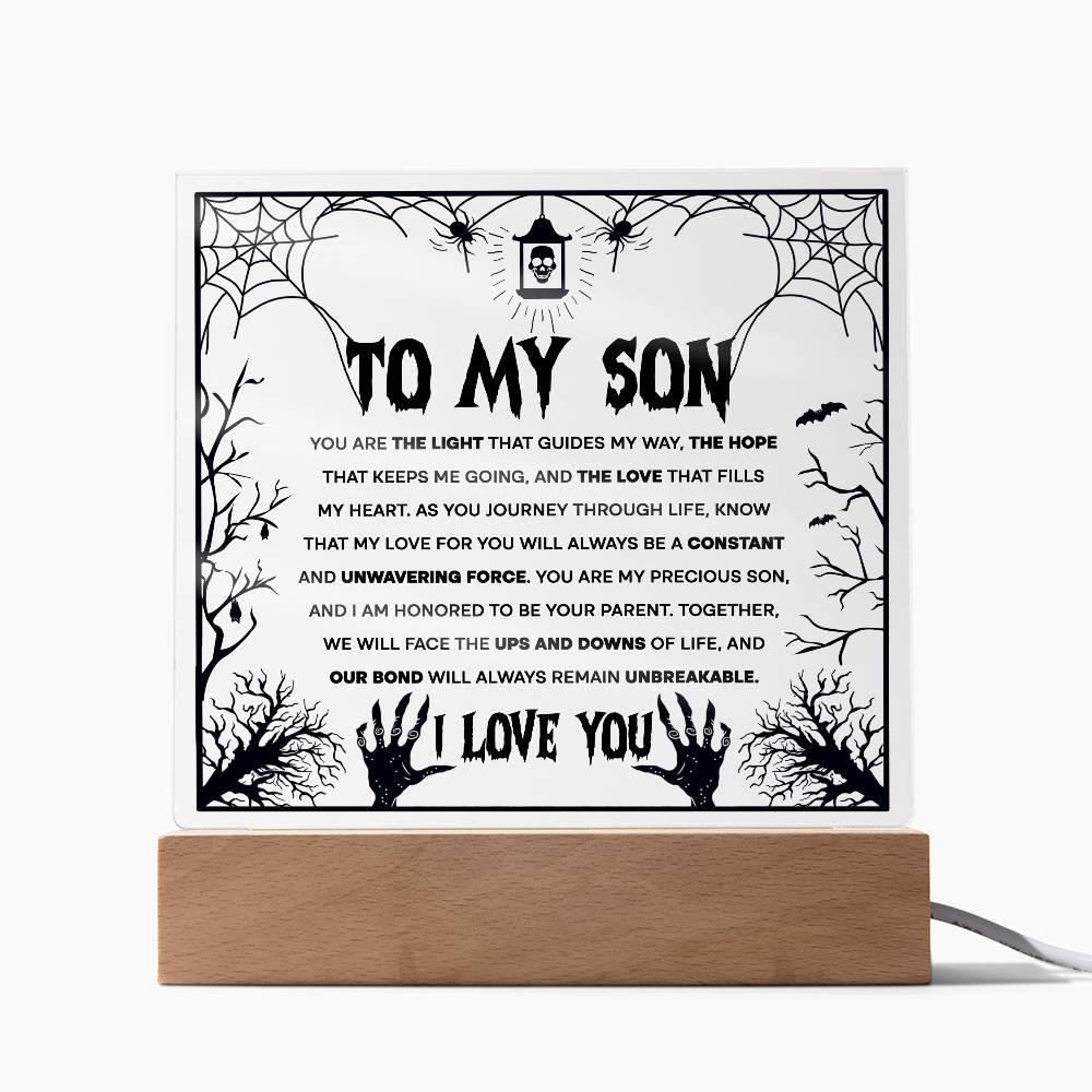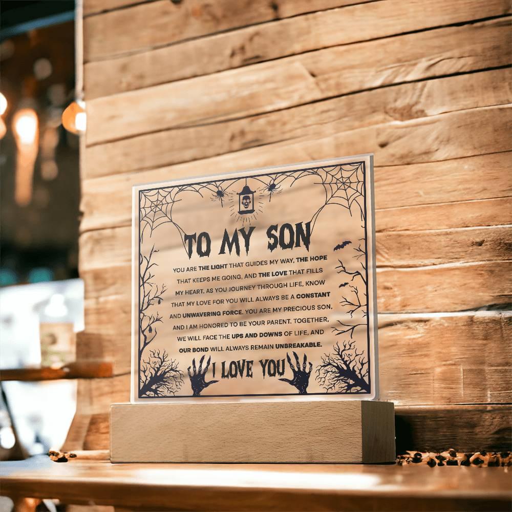 Halloween-themed acrylic plaque for your son: "To my son, you are the light that guides my way, the hope that keeps me going, and the love that fills my heart. As you journey through life, know that my love for you will always be a constant and unwavering force. You are my precious son, and I am honored to be your parent. Together, we will face the ups and downs of life, and our bond will always remain unbreakable. I Love You."