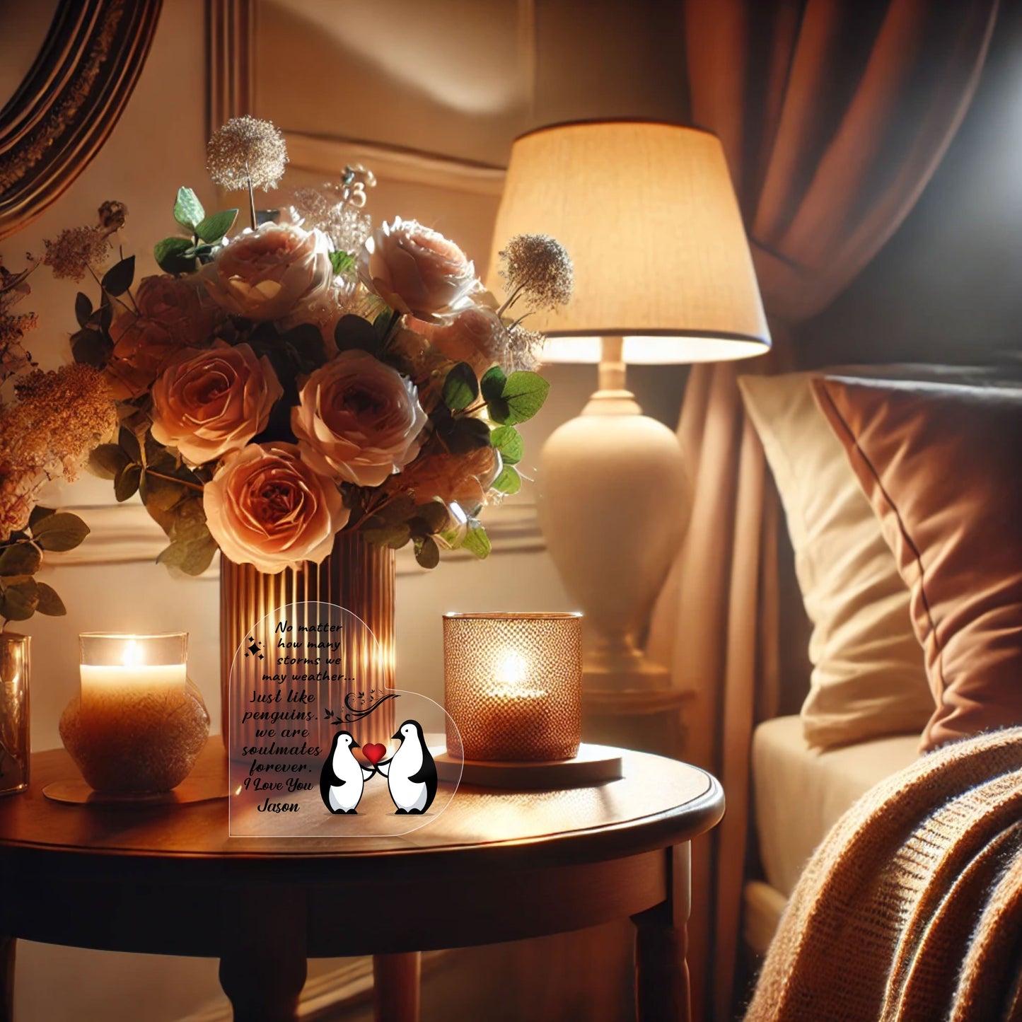 Celebrate your love with a heartfelt, beautifully crafted acrylic plaque—a symbol of an unbreakable bond, just like penguins, which mate for life. Whether for an anniversary, Valentine's Day, a wedding, or to express your deep affection, this custom piece is the perfect gift to remind your soulmate how much they mean to you.