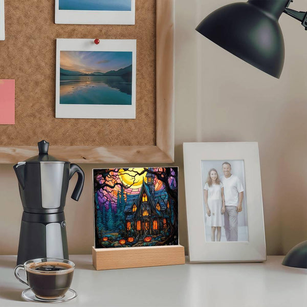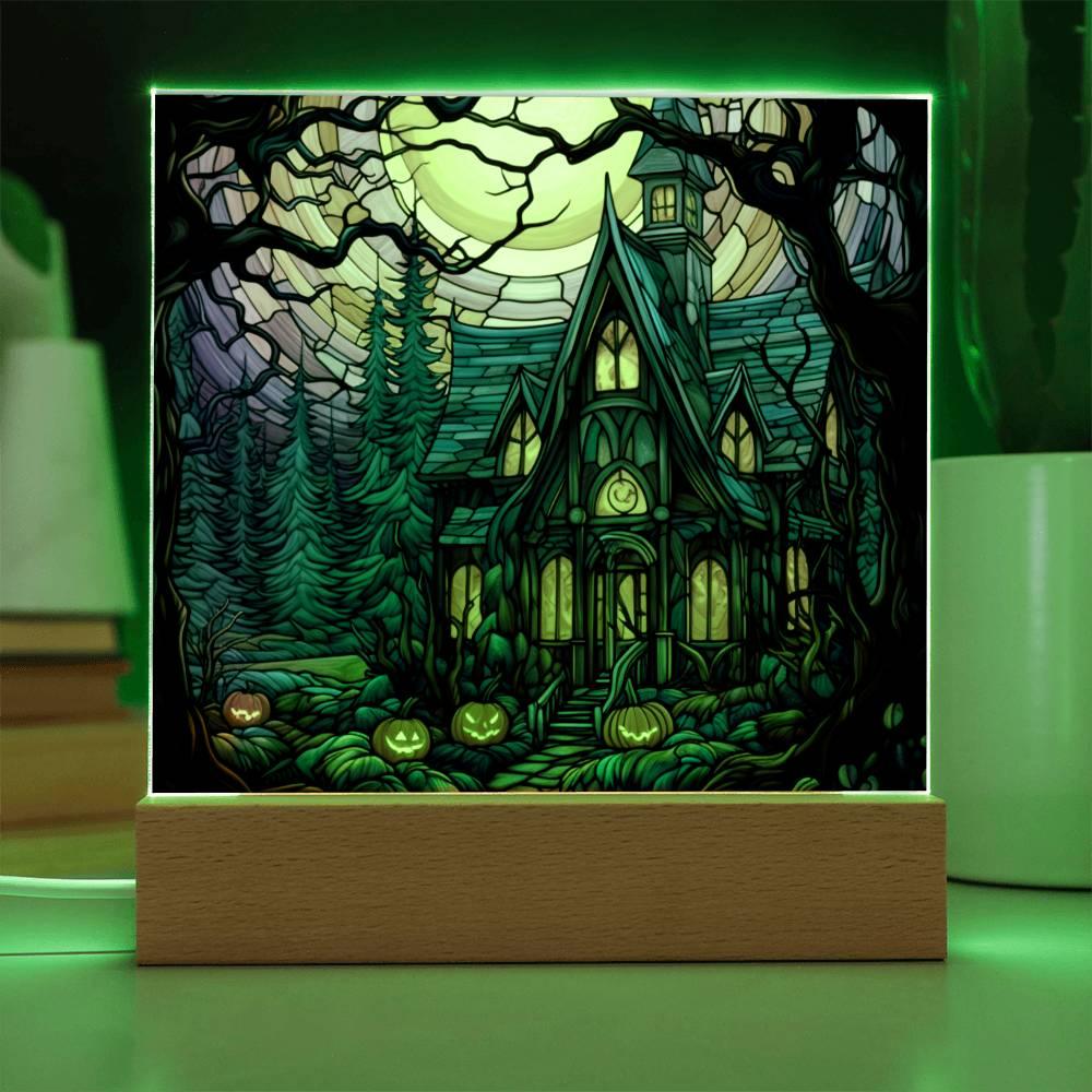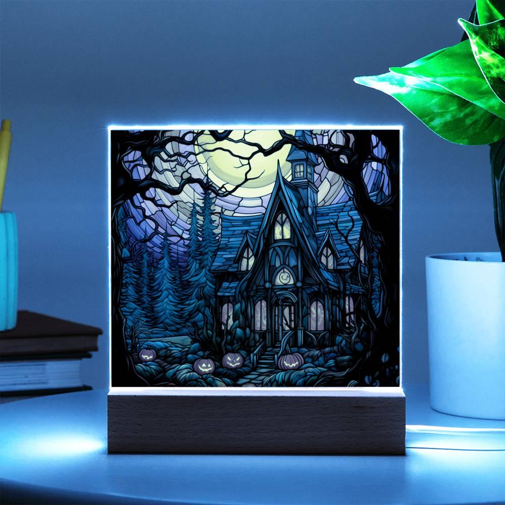 Spooky Halloween Mansion Acrylic Square Plaque with LED Lighted Wooden Base