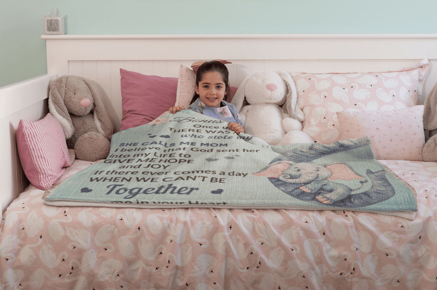 Give your bonus daughter a gift she will always treasure. This heirloom woven blanket bears a special message from your heart: "To My Bonus Daughter, Once upon a time, there was a little girl who stole my heart. She calls me Mom. I believe God sent her into my Life to give me hope and joy. If there ever comes a day when we can't be together, keep me in your heart, and I'll stay there forever. Love, Mom"