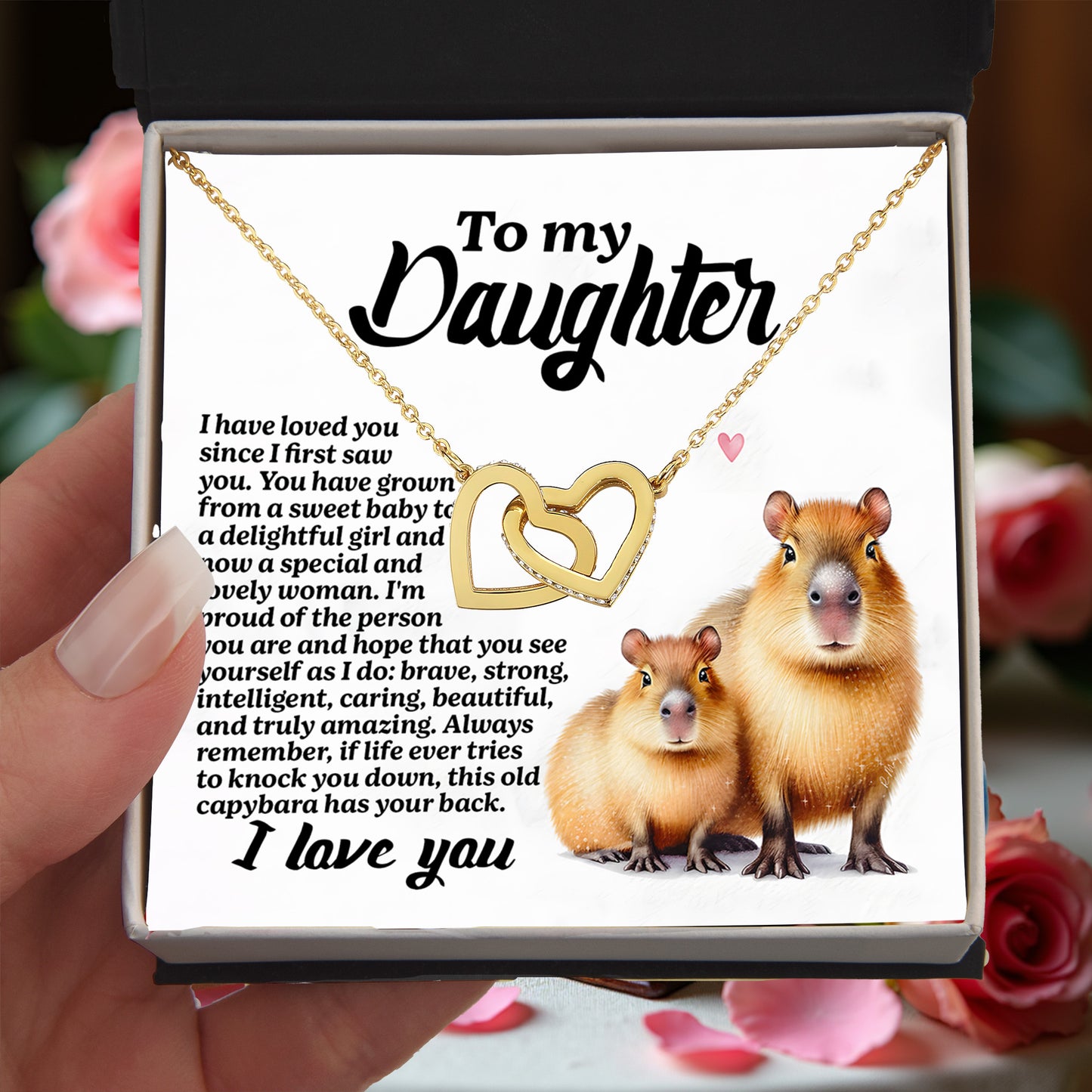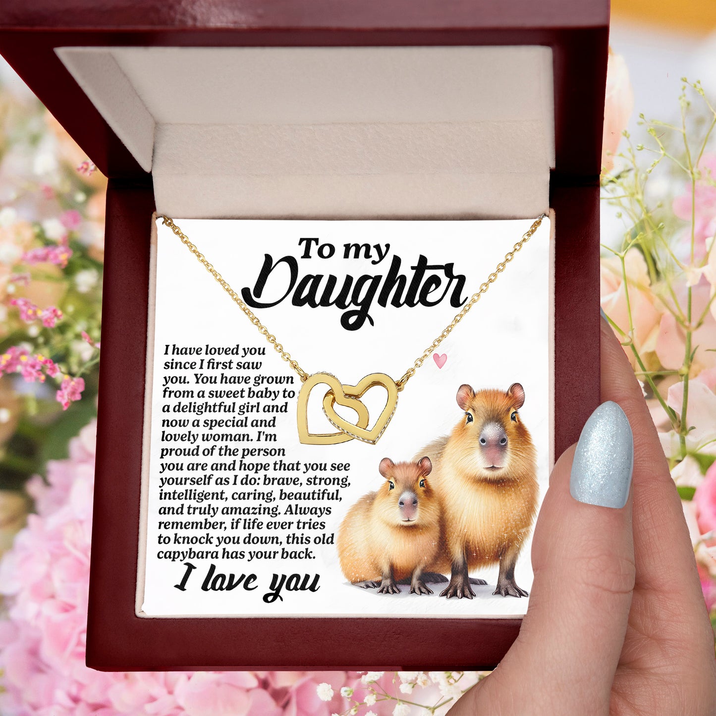 Surprise your amazing daughter with this beautiful Interlocking Hearts Necklace, featuring a sweet and meaningful message with an adorable capybara illustration. This necklace symbolizes the unbreakable bond between you and your daughter, reminding her that you will always have her back—just like this loving capybara duo!