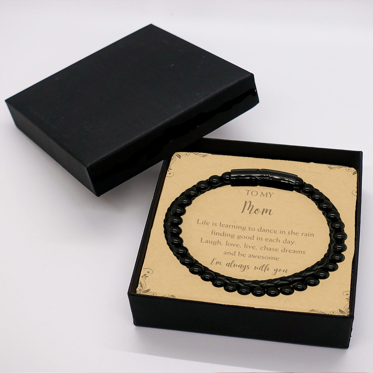 To My Mom Black Braided Leather Bracelet – Natural Stone Beads with Stainless Steel Clasp – Inspirational Gift for Mother