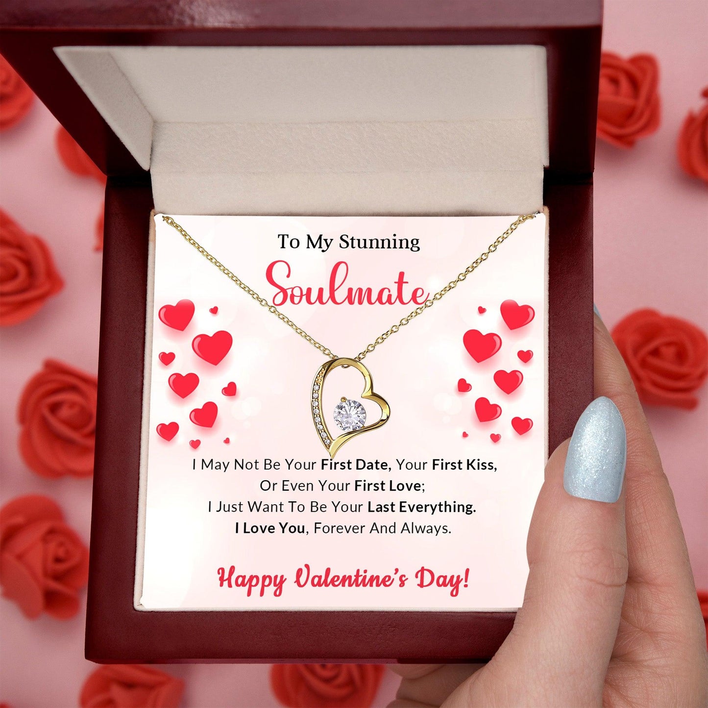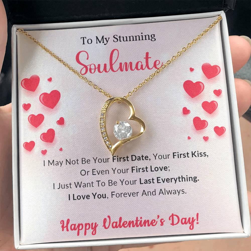 A beautiful gift for your sweetheart. "To My Stunning Soulmate, I may not be your first date, your first kiss, or even your first love; I just want to be your last everything. I love you, forever and always. Happy Valentine's Day"