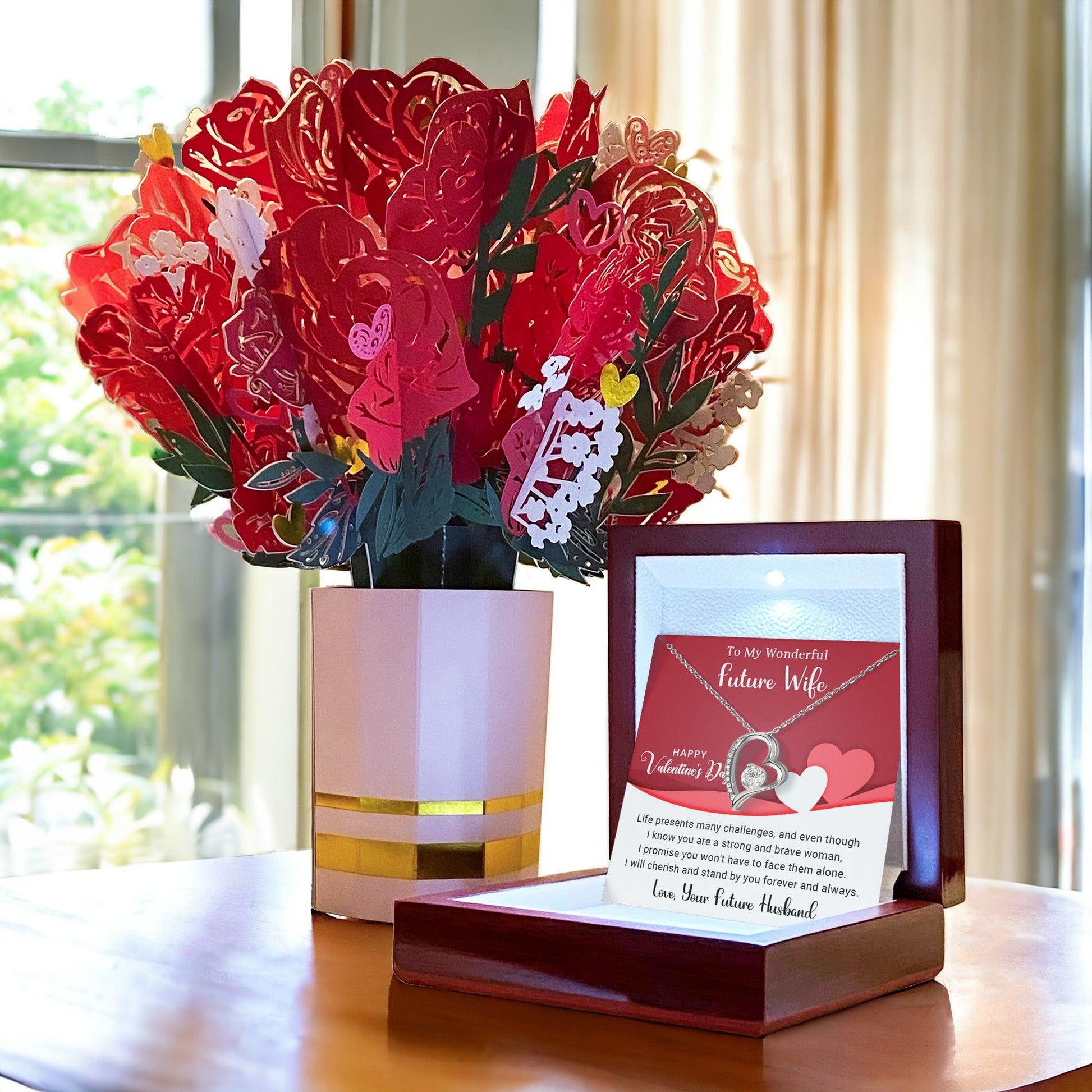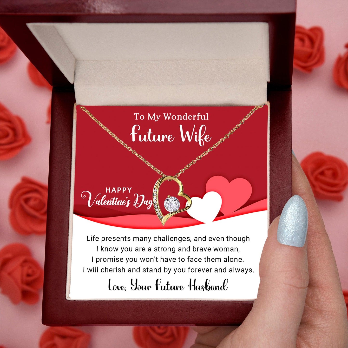A beautiful gift for your sweetheart. "To My Wonderful Future Wife, Happy Valentine's Day. Life presents many challenges, and even though I know you are a strong and brave woman, I promise you won't have to face them alone. I will cherish and stand by you forever and always. Love, Your Future Husband."