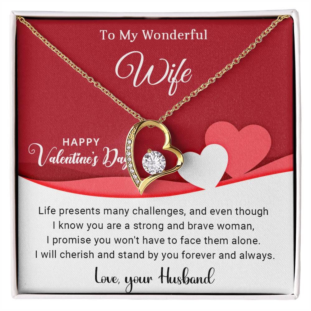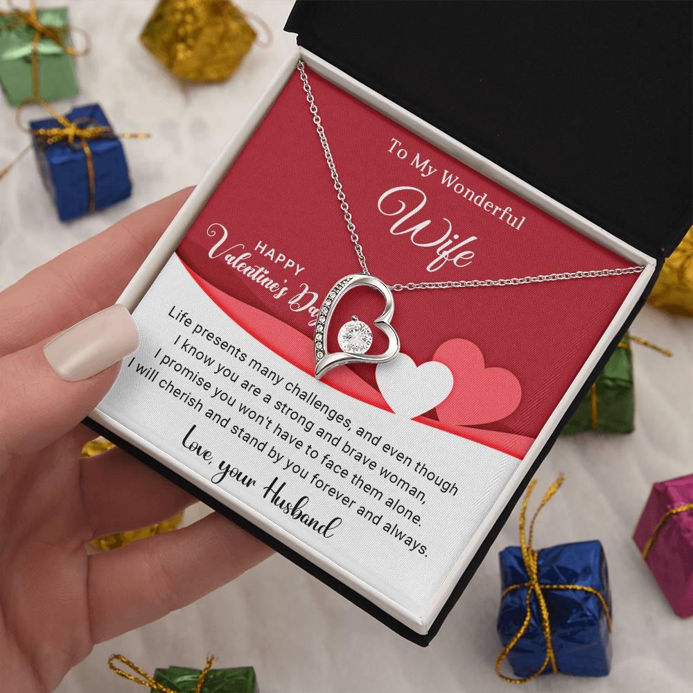 A beautiful gift for your sweetheart. To My Wonderful Wife, Happy Valentine's Day, Life presents many challenges, and even though I know you are a strong and brave woman, I promise you won't have to face them alone. I will cherish and stand by you forever and always. Love, Your Husband"