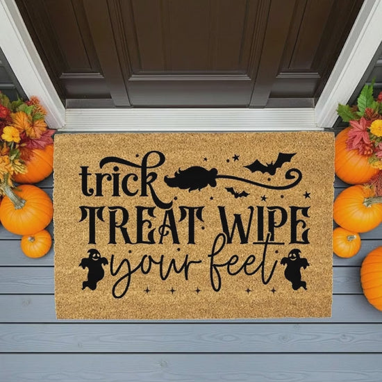 👻 Playful Halloween Message: “Trick, Treat, Wipe Your Feet” with ghost, broom, and bat graphics.