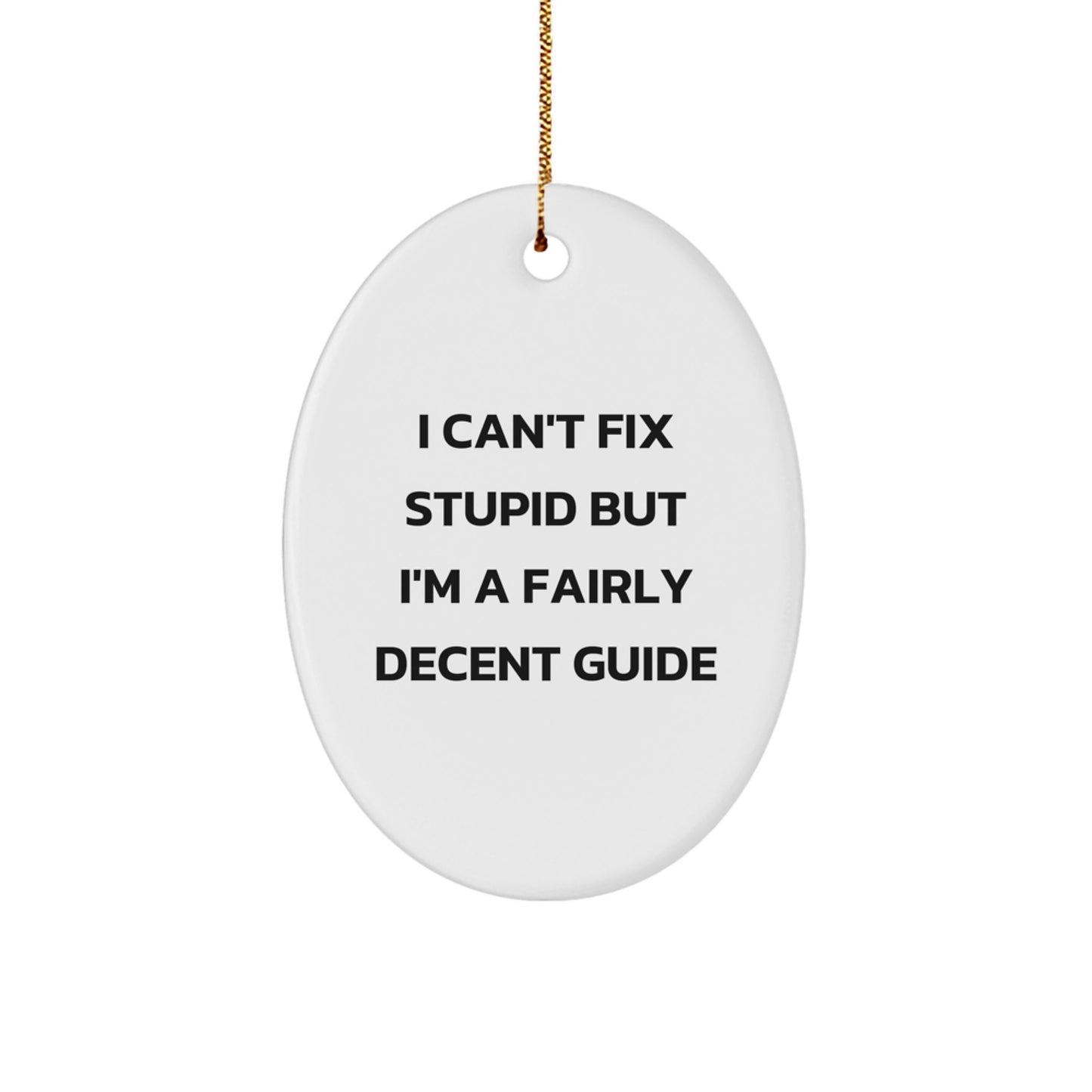 - Add a touch of humor to any room with our Oval Ornament, featuring the funny quote 'I Can't Fix Stupid But I'm A Fairly Decent Guide' - a unique gift for friends and family who love guides. Made from sturdy MDF with a high-gloss plastic finish, this ornament is vibrantly printed from edge-to-edge via Sublimation, ensuring bright and vivid colors that will last for years to come.